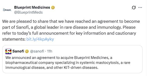 This morning, Blueprint announced that we have reached an agreement to be acquired by Sanofi for approximately $9.5 billion, or up to $135 per share in total consideration.