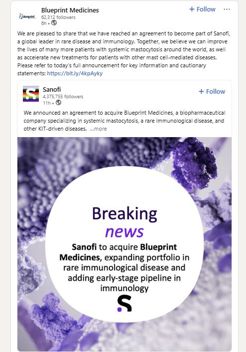 Blueprint and Sanofi are a strong strategic fit, and we believe this complementary combination will accelerate our mission to deliver life-changing medicines to patients. Blueprint’s portfolio of mast cell targeted therapies fits seamlessly with Sanofi’s global leadership in rare diseases and immunology and inflammation. With exceptional strength in these areas spanning discovery to commercialization, Sanofi will enable us to accelerate our mission and help many more patients around the world.