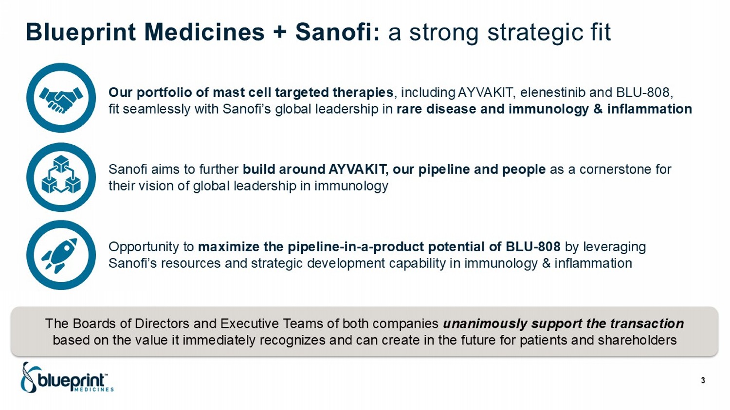 Blueprint Medicines + Sanofi: a strong strategic fit 2 Well - established global leadership in rare disease and immunology & inflammation Significant resources, infrastructure & capability, and global reach Similar mission and culture centering science and patient impact Leading SM franchise at the intersection of rare disease and immunology & inflammation Mast cell expertise and pipeline at the forefront of innovation in immunology & inflammation Culture of excellence and proven track record of success in delivering innovation to patients Accelerates Blueprint’s mission to deliver life - changing medicines to more patients globally , and creates a cornerstone for Sanofi’s vision of global leadership in immunology