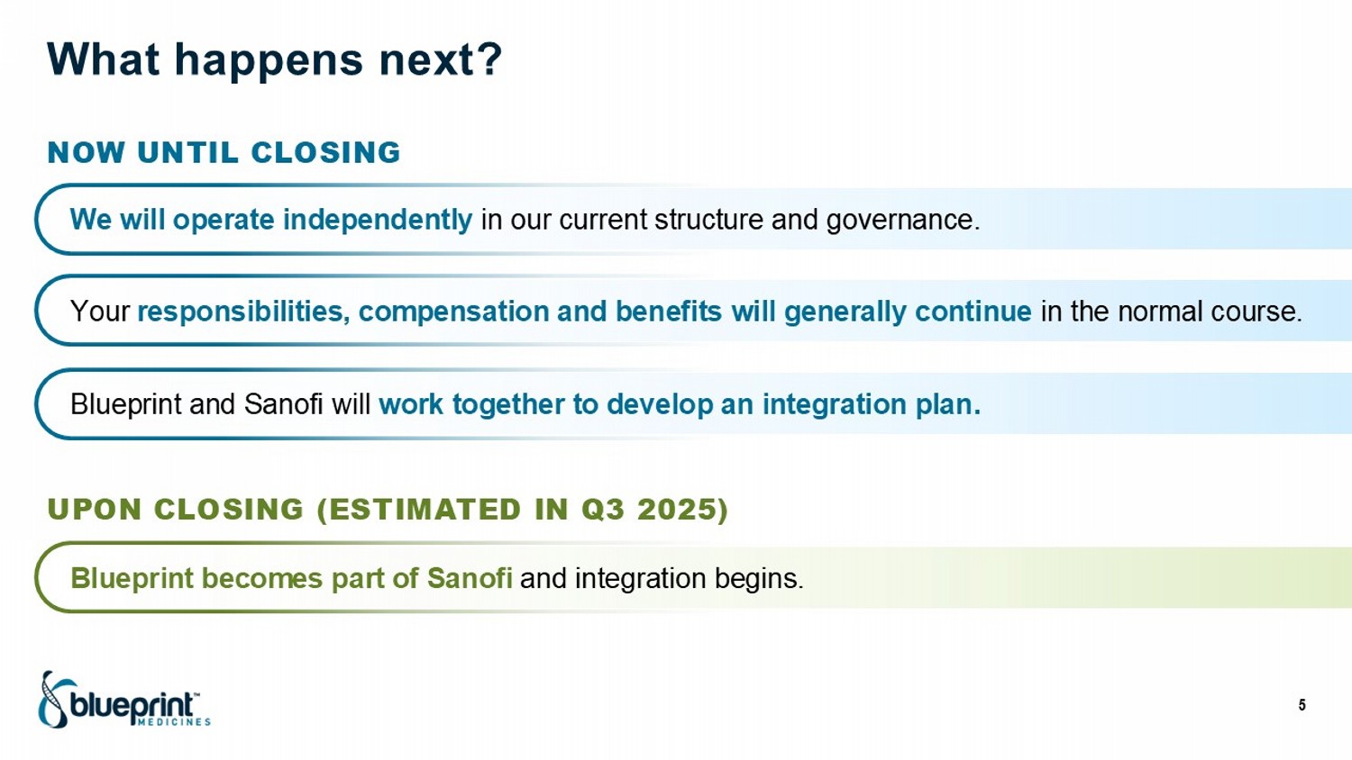 Blueprint and Sanofi will continue to operate as independent companies until the transaction closes. To fulfill our commitments to the patients, providers and partners who rely on us and to further strengthen the foundation for the work we will do with Sanofi in the future, all of us at Blueprint must continue to focus on our current priorities and day-to-day responsibilities. Until the transaction closes, we will operate our business as usual with our current governance, team and individual scopes of responsibility and reporting structures. As we develop plans for integrating our companies upon closing, we are committed to communicating transparently and continuing to support the wellbeing of our employees.