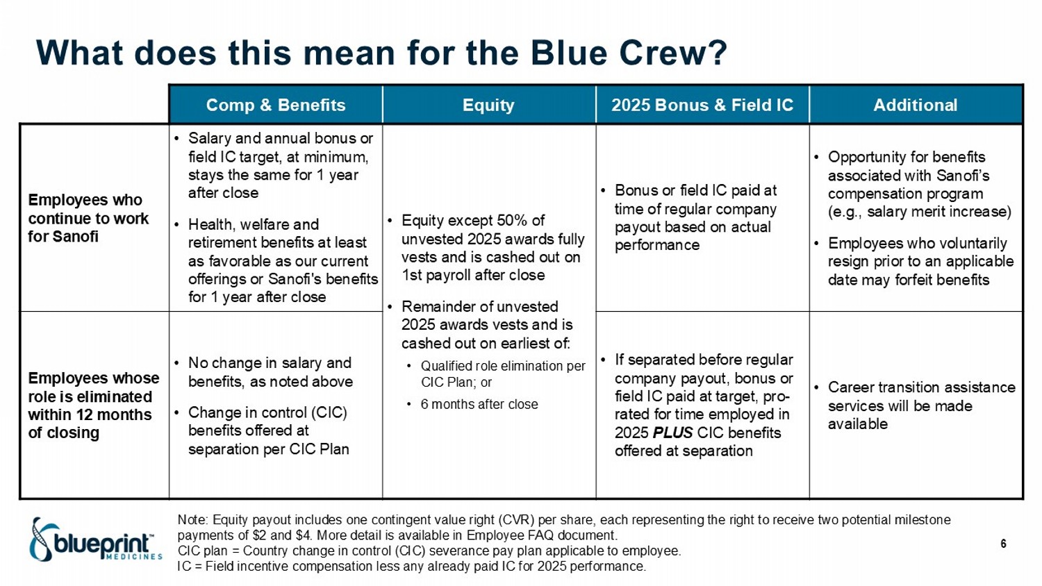 2025 equity award grants generally have a 4-year vesting schedule completing in 2029. While 50% of these unvested awards will not pay out at closing, Blueprint and Sanofi have agreed to accelerate and pay out such unvested equity awards before 2029 to recognize the significant contributions of Blueprint employees in building the company and advancing our business. In addition, Sanofi has expressed how energized they are to work alongside members of the Blue Crew, and the payout structure supports Sanofi’s vision for continuity during integration and ultimately the long-term success of our business.