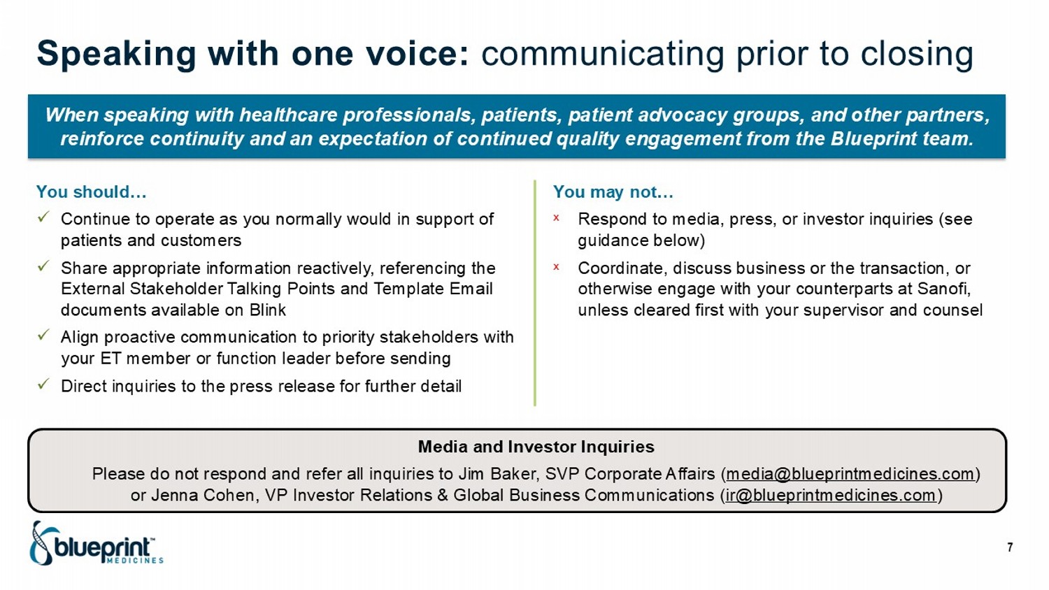 Speaking with one voice: communicating prior to closing 7 Media and Investor Inquiries Please do not respond and refer all inquiries to Jim Baker, SVP Corporate Affairs ( media@blueprintmedicines.com ) or Jenna Cohen, VP Investor Relations & Global Business Communications ( ir@blueprintmedicines.com ) When speaking with healthcare professionals, patients, patient advocacy groups, and other partners, reinforce continuity and an expectation of continued quality engagement from the Blueprint team. You should… x Continue to operate as you normally would in support of patients and customers x Share appropriate information reactively, referencing the External Stakeholder Talking Points and Template Email documents available on Blink x Align proactive communication to priority stakeholders with your ET member or function leader before sending x Direct inquiries to the press release for further detail You may not… ˣ Respond to media, press, or investor inquiries (see guidance below) ˣ Coordinate, discuss business or the transaction, or otherwise engage with your counterparts at Sanofi, unless cleared first with your supervisor and counsel