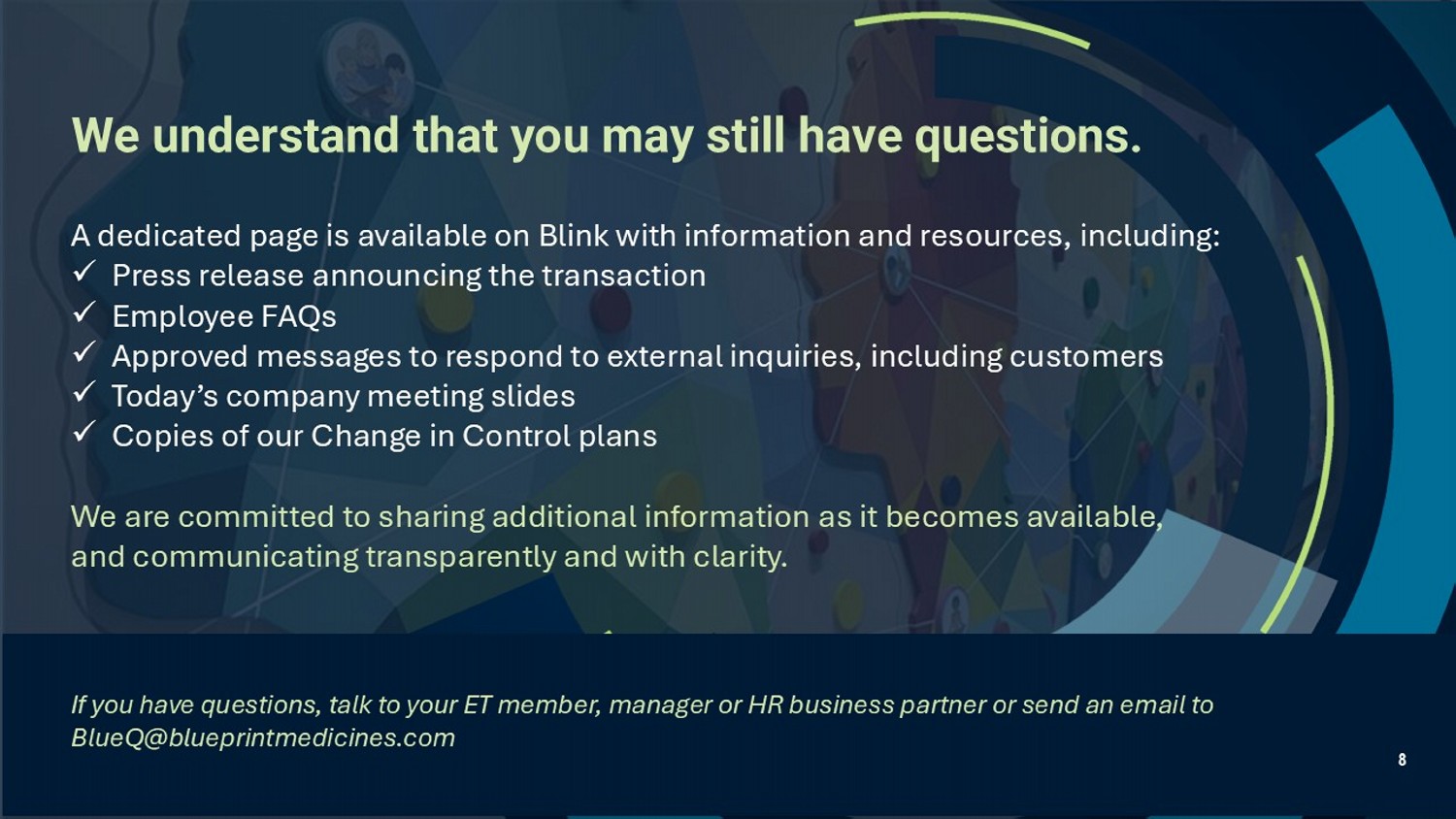We understand that you may still have questions. A dedicated page is available on Blink with information and resources, including: x Press release announcing the transaction x Employee FAQs x Approved messages to respond to external inquiries, including customers x Today’s company meeting slides x Copies of our Change in Control plans We are committed to sharing additional information as it becomes available, and communicating transparently and with clarity. If you have questions, talk to your ET member, manager or HR business partner or send an email to BlueQ@blueprintmedicines.com 8