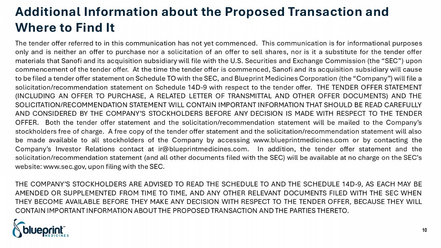 Additional Information about the Proposed Transaction and Where to Find It 10 The tender offer referred to in this communication has not yet commenced . This communication is for informational purposes only and is neither an offer to purchase nor a solicitation of an offer to sell shares, nor is it a substitute for the tender offer materials that Sanofi and its acquisition subsidiary will file with the U . S . Securities and Exchange Commission (the “SEC”) upon commencement of the tender offer . At the time the tender offer is commenced, Sanofi and its acquisition subsidiary will cause to be filed a tender offer statement on Schedule TO with the SEC, and Blueprint Medicines Corporation (the “Company”) will file a solicitation/recommendation statement on Schedule 14 D - 9 with respect to the tender offer . THE TENDER OFFER STATEMENT (INCLUDING AN OFFER TO PURCHASE, A RELATED LETTER OF TRANSMITTAL AND OTHER OFFER DOCUMENTS) AND THE SOLICITATION/RECOMMENDATION STATEMENT WILL CONTAIN IMPORTANT INFORMATION THAT SHOULD BE READ CAREFULLY AND CONSIDERED BY THE COMPANY’S STOCKHOLDERS BEFORE ANY DECISION IS MADE WITH RESPECT TO THE TENDER OFFER . Both the tender offer statement and the solicitation/recommendation statement will be mailed to the Company’s stockholders free of charge . A free copy of the tender offer statement and the solicitation/recommendation statement will also be made available to all stockholders of the Company by accessing www . blueprintmedicines . com or by contacting the Company’s Investor Relations contact at ir@blueprintmedicines . com . In addition, the tender offer statement and the solicitation/recommendation statement (and all other documents filed with the SEC) will be available at no charge on the SEC’s website : www . sec . gov, upon filing with the SEC . THE COMPANY’S STOCKHOLDERS ARE ADVISED TO READ THE SCHEDULE TO AND THE SCHEDULE 14 D - 9 , AS EACH MAY BE AMENDED OR SUPPLEMENTED FROM TIME TO TIME, AND ANY OTHER RELEVANT DOCUMENTS FILED WITH THE SEC WHEN THEY BECOME AVAILABLE BEFORE THEY MAKE ANY DECISION WITH RESPECT TO THE TENDER OFFER, BECAUSE THEY WILL CONTAIN IMPORTANT INFORMATION ABOUT THE PROPOSED TRANSACTION AND THE PARTIES THERETO .