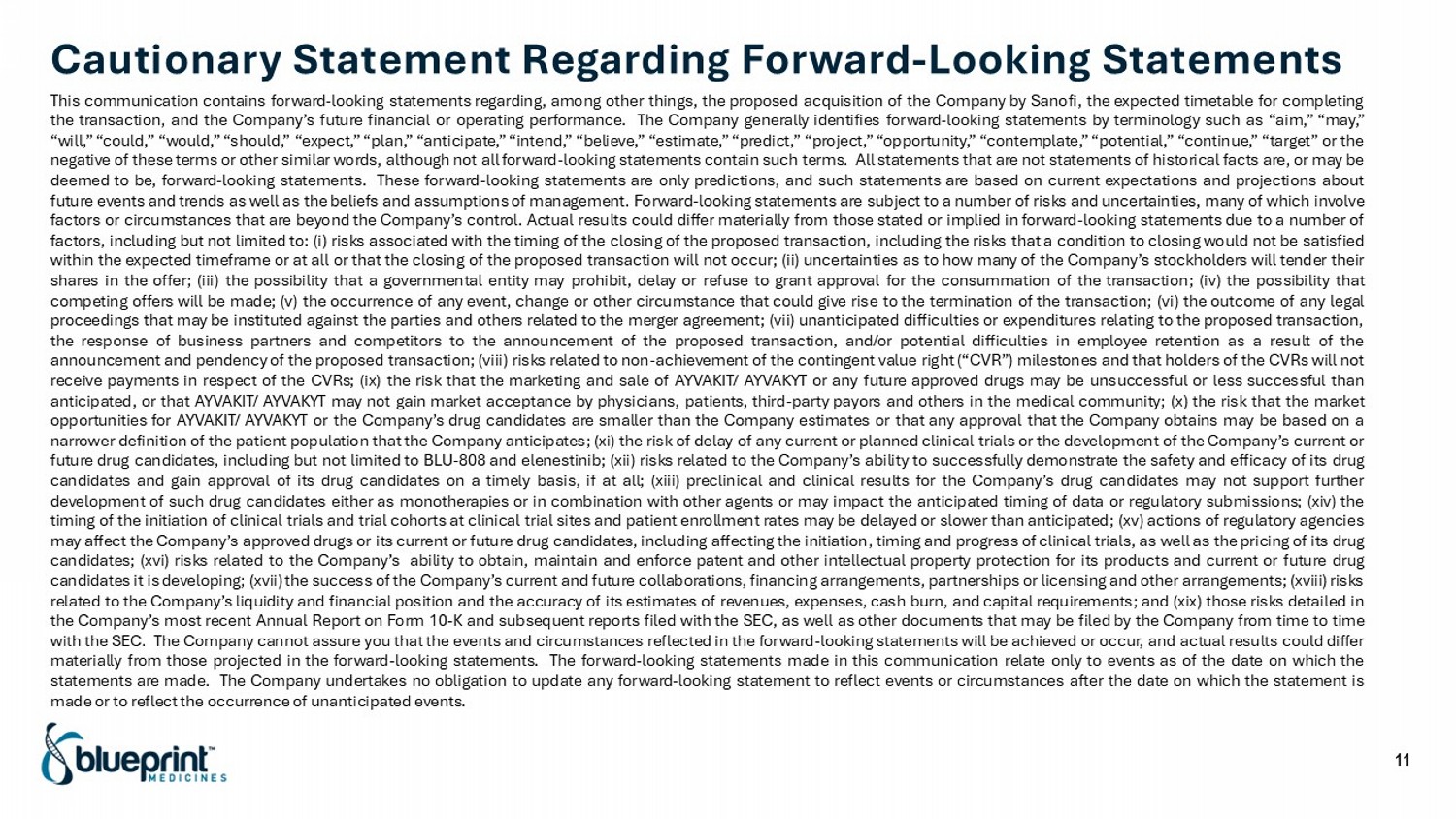 This document contains forward-looking statements regarding, among other things, the proposed acquisition of the Company by Parent, the expected timetable for completing the transaction, and the Company’s future financial or operating performance. The Company generally identifies forward-looking statements by terminology such as “aim,” “may,” “will,” “could,” “would,” “should,” “expect,” “plan,” “anticipate,” “intend,” “believe,” “estimate,” “predict,” “project,” “opportunity,” “contemplate,” “potential,” “continue,” “target” or the negative of these terms or other similar words, although not all forward-looking statements contain such terms. All statements that are not statements of historical facts are, or may be deemed to be, forward-looking statements. These forward-looking statements are only predictions, and such statements are based on current expectations and projections about future events and trends as well as the beliefs and assumptions of management. Forward-looking statements are subject to a number of risks and uncertainties, many of which involve factors or circumstances that are beyond the Company’s control. Actual results could differ materially from those stated or implied in forward-looking statements due to a number of factors, including but not limited to: (i) risks associated with the timing of the closing of the proposed transaction, including the risks that a condition to closing would not be satisfied within the expected timeframe or at all or that the closing of the proposed transaction will not occur; (ii) uncertainties as to how many of the Company’s stockholders will tender their shares in the offer; (iii) the possibility that a governmental entity may prohibit, delay or refuse to grant approval for the consummation of the transaction; (iv) the possibility that competing offers will be made; (v) the occurrence of any event, change or other circumstance that could give rise to the termination of the transaction; (vi) the outcome of any legal proceedings that may be instituted against the parties and others related to the merger agreement; (vii) unanticipated difficulties or expenditures relating to the proposed transaction, the response of business partners and competitors to the announcement of the proposed transaction, and/or potential difficulties in employee retention as a result of the announcement and pendency of the proposed transaction; (viii) risks related to non-achievement of the CVR milestones and that holders of the CVRs will not receive payments in respect of the CVRs; (ix) the risk that the marketing and sale of AYVAKIT/ AYVAKYT or any future approved drugs may be unsuccessful or less successful than anticipated, or that AYVAKIT/ AYVAKYT may not gain market acceptance by physicians, patients, third-party payors and others in the medical community; (x) the risk that the market opportunities for AYVAKIT/ AYVAKYT or the Company’s drug candidates are smaller than the Company estimates or that any approval that the Company obtains may be based on a narrower definition of the patient population that the Company anticipates; (xi) the risk of delay of any current or planned clinical trials or the development of the Company’s current or future drug candidates, including but not limited to BLU-808 and elenestinib; (xii) risks related to the Company’s ability to successfully demonstrate the safety and efficacy of its drug candidates and gain approval of its drug candidates on a timely basis, if at all; (xiii) preclinical and clinical results for the Company’s drug candidates may not support further development of such drug candidates either as monotherapies or in combination with other agents or may impact the anticipated timing of data or regulatory submissions; (xiv) the timing of the initiation of clinical trials and trial cohorts at clinical trial sites and patient enrollment rates may be delayed or slower than anticipated; (xv) actions of regulatory agencies may affect the Company’s approved drugs or its current or future drug candidates, including affecting the initiation, timing and progress of clinical trials, as well as the pricing of its drug candidates; (xvi) risks related to the Company’s ability to obtain, maintain and enforce patent and other intellectual property protection for its products and current or future drug candidates it is developing; (xvii) the success of the Company’s current and future collaborations, financing arrangements, partnerships or licensing and other arrangements; (xviii) risks related to the Company’s liquidity and financial position and the accuracy of its estimates of revenues, expenses, cash burn, and capital requirements; and (xix) those risks detailed in the Company’s most recent Annual Report on Form 10-K and subsequent reports filed with the SEC, as well as other documents that may be filed by the Company from time to time with the SEC. The Company cannot assure you that the events and circumstances reflected in the forward-looking statements will be achieved or occur, and actual results could differ materially from those projected in the forward-looking statements. The forward-looking statements made in this document relate only to events as of the date on which the statements are made. The Company undertakes no obligation to update any forward-looking statement to reflect events or circumstances after the date on which the statement is made or to reflect the occurrence of unanticipated events.